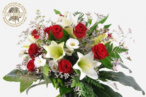 זר עוצמתי המורכב מורדי אהבה, שושן צחור וליזיאנטוס לבן.